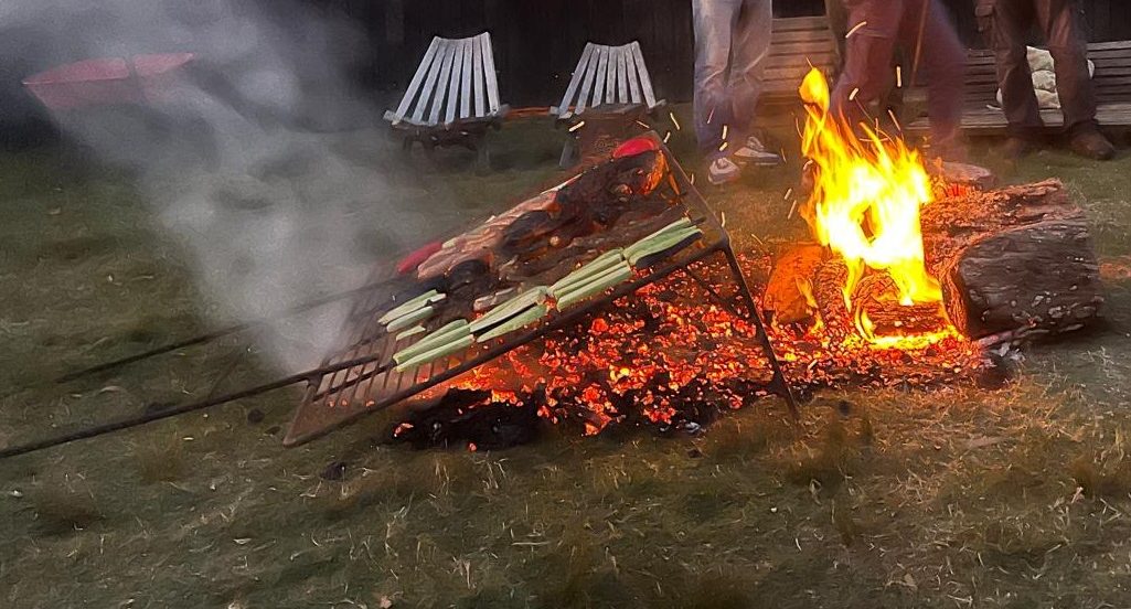 A couple nights ago here at Pinos de la Quebrada (a small rural estancia in the rural Interior of Uruguay), we had an asado prepared in the traditional manner with the fire on the ground and various meats suspended above the coals. Chairs were assembled around and people gathered with drinks and conversation.